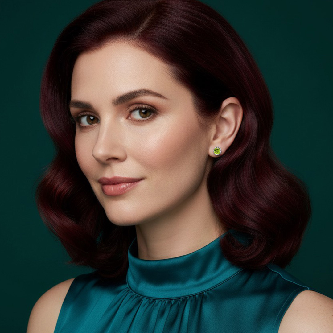 These are faceted Peridot stones in stud Earrings. Peridot is a soft green colored stone. The Earrings have small white Diamonds in a halo around the Peridot stones. The Earrings are set in Sterling Silver with Rhodium plating to keep them from tarnishing. They have a post back.