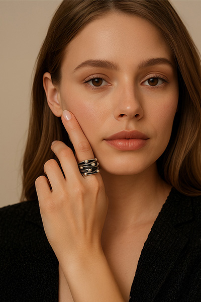 This Mexican Ring is made in Sterling Silver with a design throughout the Ring. The Ring is made in Sizes 7.5 and 8. For a reasonable fee, the size of this Ring can be modified.
